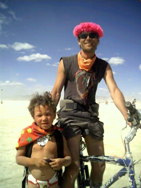2004 was a year of travel and adventure for me. I spent about six months traveling in Northern California, the peak of the experience being six weeks volunteering for the Department of Public Works crew of Burning Man in Northern Nevada. Burning Man is an experiment in temporary community, a forum for radical self expression, a gift economy, a ticketless amusement park, a week in adverse desert conditions, and maybe the worlds biggest rave. While previous travels were recorded in my journal, but not in pictures, the rich visual experience of Burning Man drew me to pull out my little EarthLink digital camera and take almost 300 pictures. (Clockwise from top-left, see Camera Girl, Mark and Ezra, the Man, art car, robot and friends, Poop Patrol, and painted man. Below, see panaroma of promenade.)